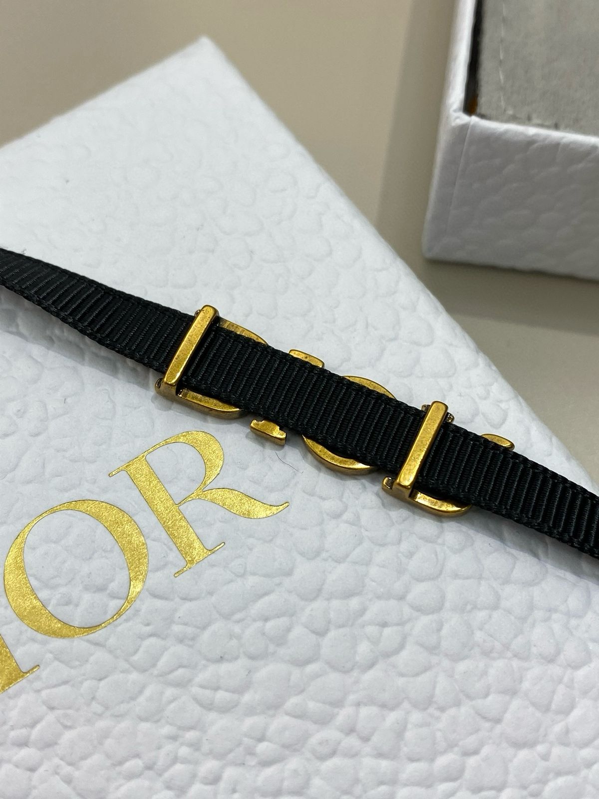 Elevate your look with the Dior choker necklace, featuring the iconic “DIOR” logo in gold tone metal on a sleek black ribbon band. Adjustable for the perfect fit, this timeless piece adds elegance and modern sophistication to any outfit.