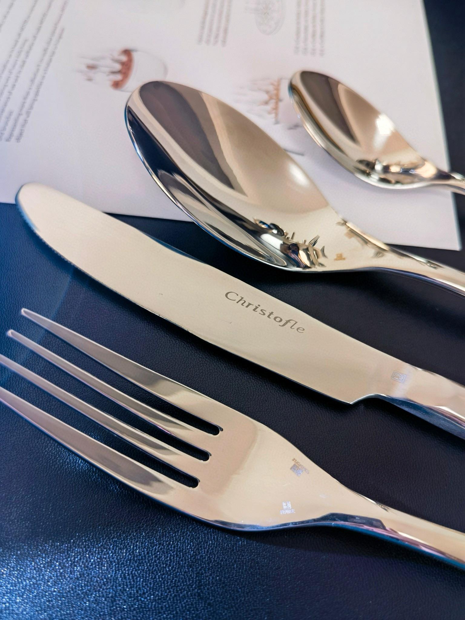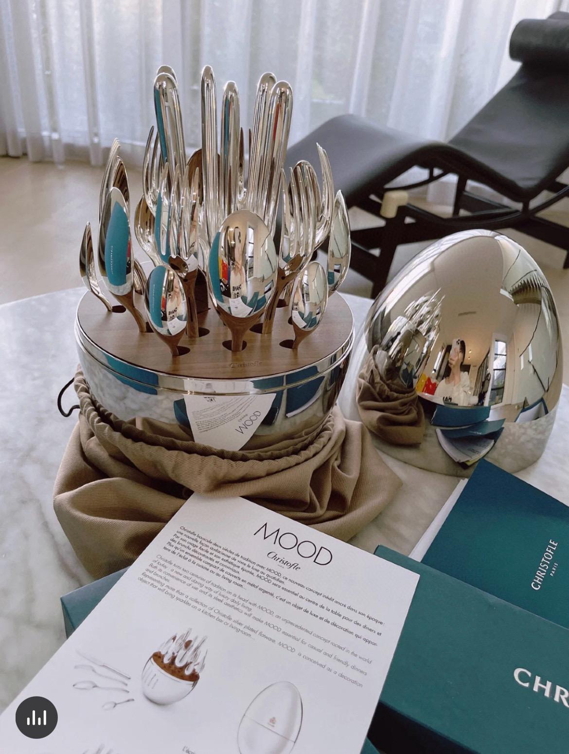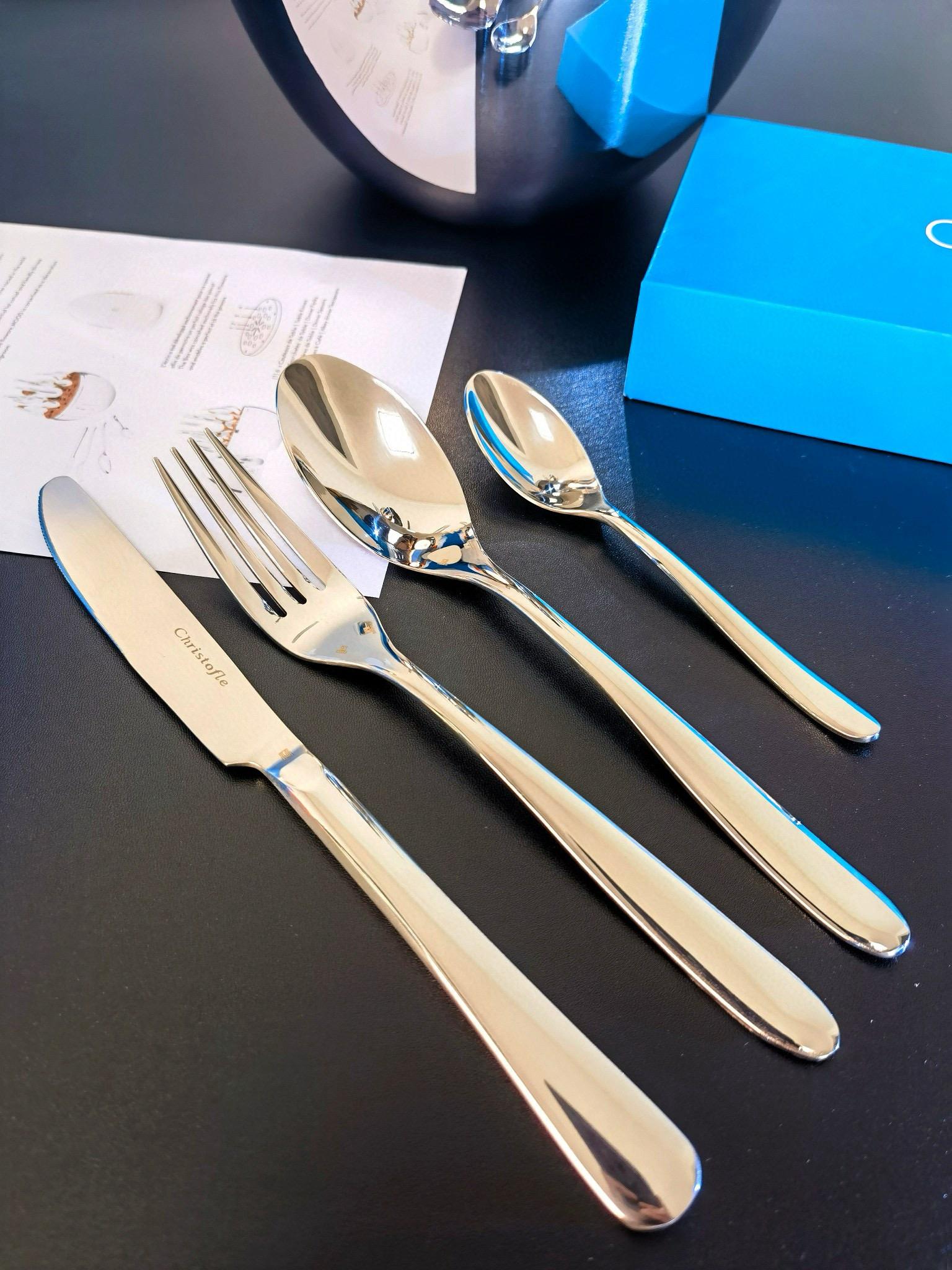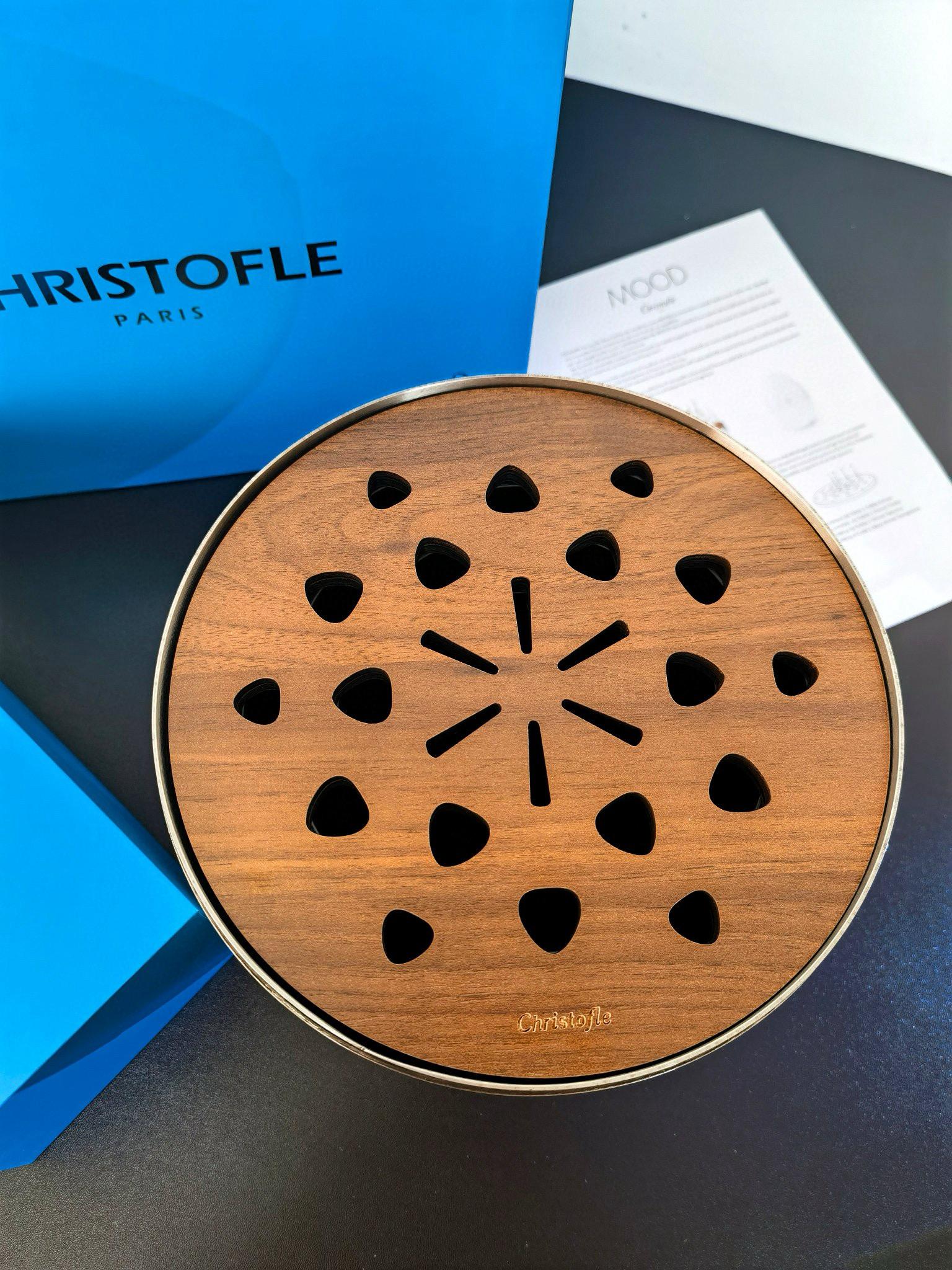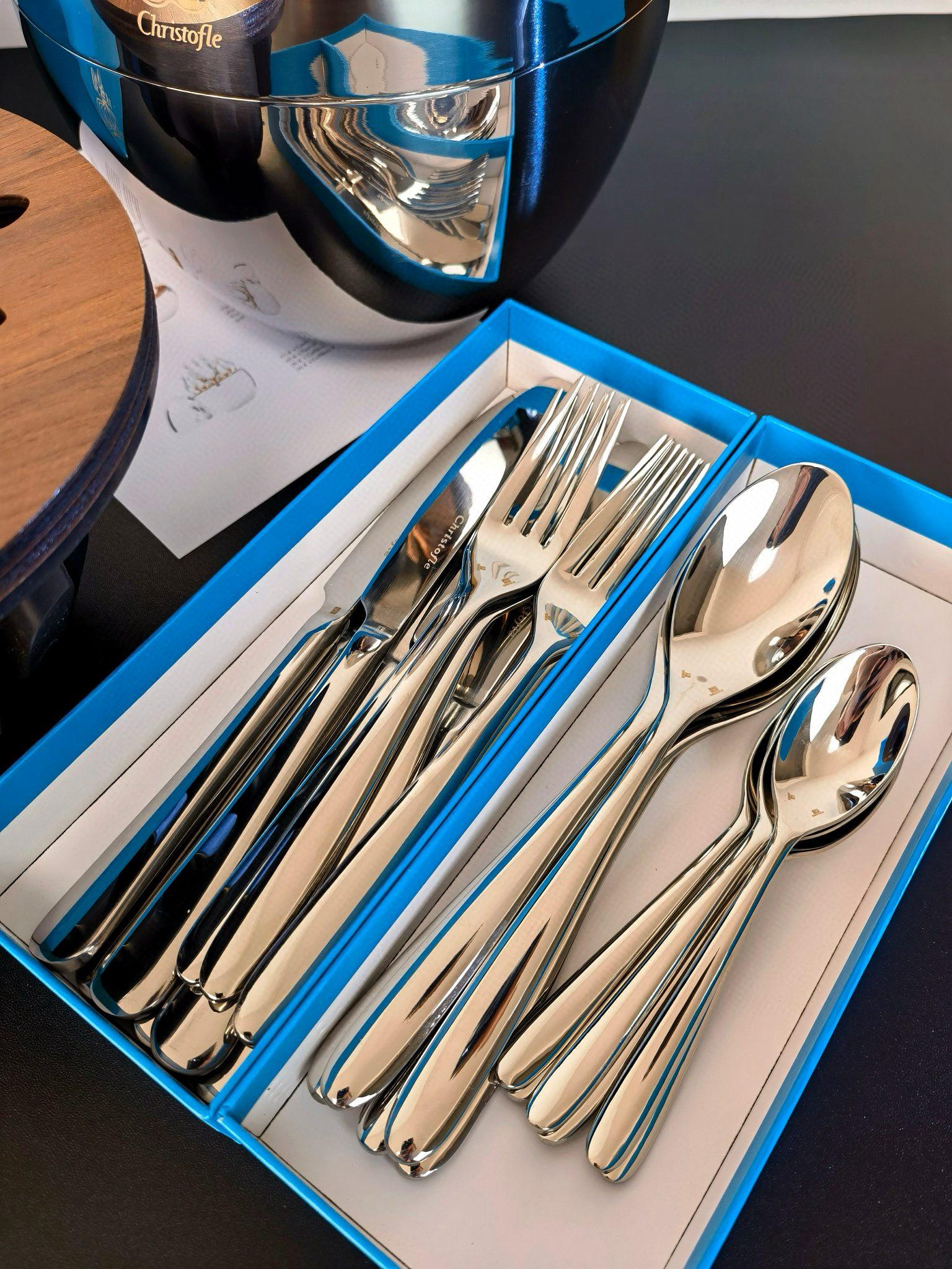 MOOD by Christofle is a contemporary silver-plated flatware set presented in a sleek, egg-shaped case. Designed as both functional cutlery and a decorative object, it brings elegance and modern style to any dining table. The set includes essential utensils, beautifully arranged to enhance both daily dining and special occasions.