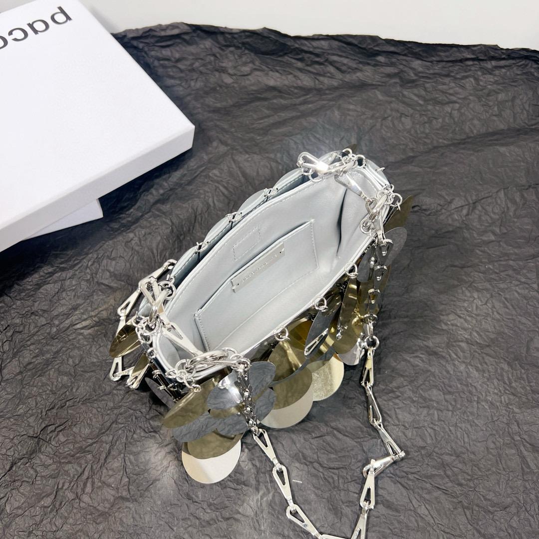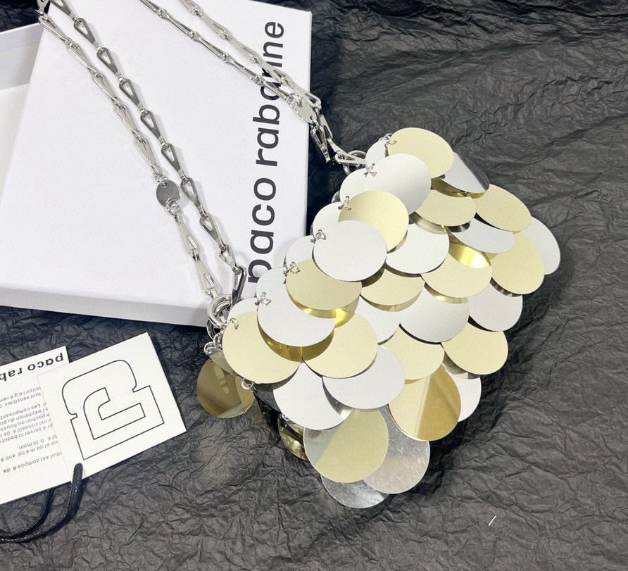 The Paco Rabanne 1969 Disc Bag is a bold statement piece crafted from interlinked metallic discs in silver and gold tones. With its signature chain strap and avant-garde design, this bag embodies the brand’s futuristic heritage while offering a glamorous, modern edge.